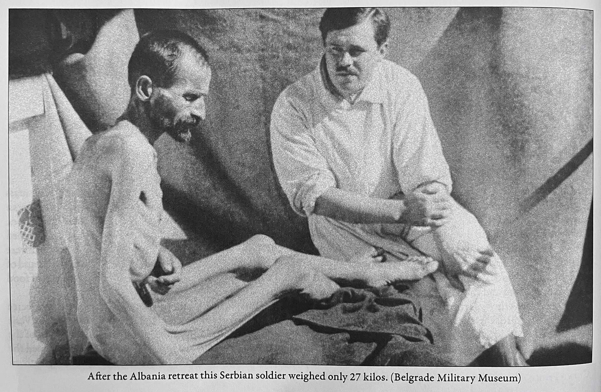 In October 1915 the Austro-German and Bulgarian invasion of Serbia resulted in around 400,000 Serb civilians and soldiers (and a few hundred British naval servicemen, doctors, and nurses) retreating across the Albanian Alps in mid-winter. En route over the high snowy mountains, pursued by the enemy and attacked by hostile Albanian locals, around 237,000 of them died from violence, cold and starvation. It was known to the Serbs as the Golgotha.